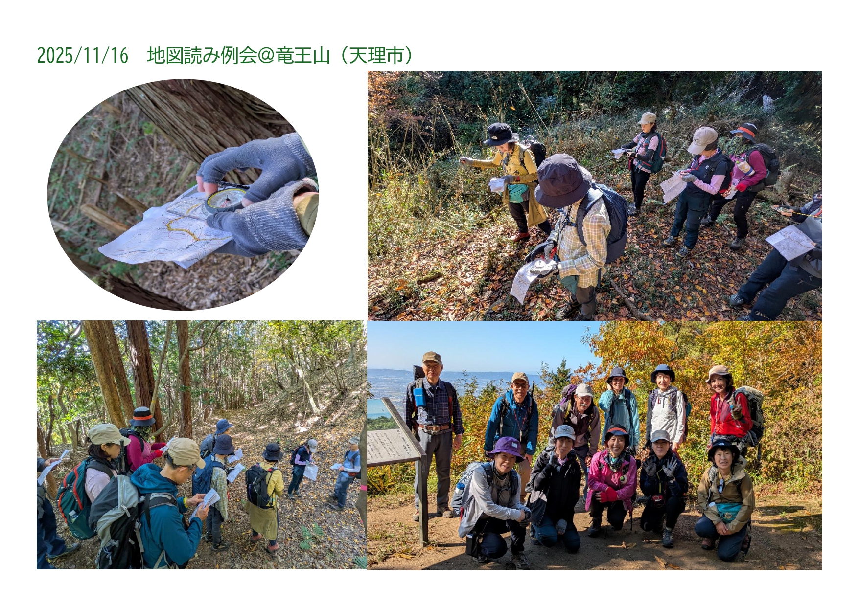 紅葉も見頃の秋晴れの一日、竜王山で読図山行を行いました。まず、集合地点で、地図、コンパスの使い方について基礎的なレクチャ―を受け、地図の折り方も教えてもらい、早速、地図とコンパスを手に出発。特徴的なポイントで、説明を聞き、先頭を交代しながら、次の目的地まで。先頭は緊張しました・・・。道の分岐では、コンパスを合わせて方向を確認する練習を繰り返しました。尾根、谷、隠れピークなど、地図にあらわされている地形が、実際にはこんな風景なのか、と納得したり。ここに道があるのに、地図には載っていないことに気付いたり。真剣に、でも、とても楽しく歩きました。少しでも読図ができると、とても楽しいと思えました。これからも、地図とコンパスを友達にします!