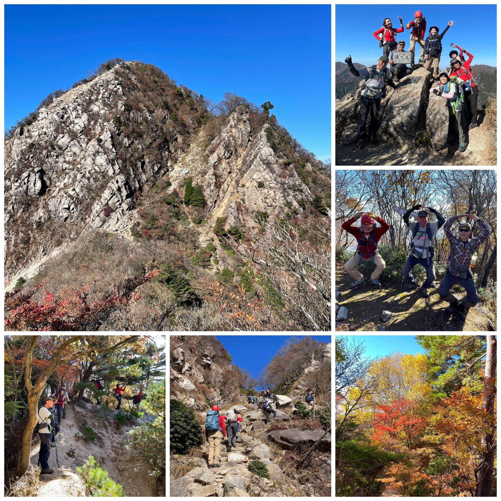取り付きからいきなりの急登、ちょいバリルートで木の幹や根を掴みながら、ルートを確認 しながら登っていった。尾根に出てからは快適に歩いた。山頂まで少し岩場もあったが参加 された皆さん健脚で、標準タイムよりも早く鎌ヶ岳に着いた。お天気も良く、紅葉も見頃で 山頂は登山客で賑わっていた。下りは一般道で歩きやすく、予定より30分以上早く下山した。